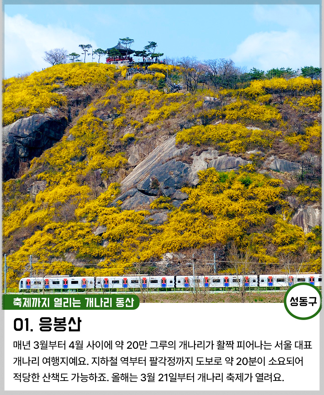 매년 3월부터 4월 사이에 약 20만 그루의 개나리가 활짝 피어나는 서울의 대표 개나리 여행지예요. 지하철 역에서부터 팔각정까지 도보로 약 20분 소요되어 적당한 산택도 가능하죠. 올해는 3월 21일부터 개나리 축제가 열려요.