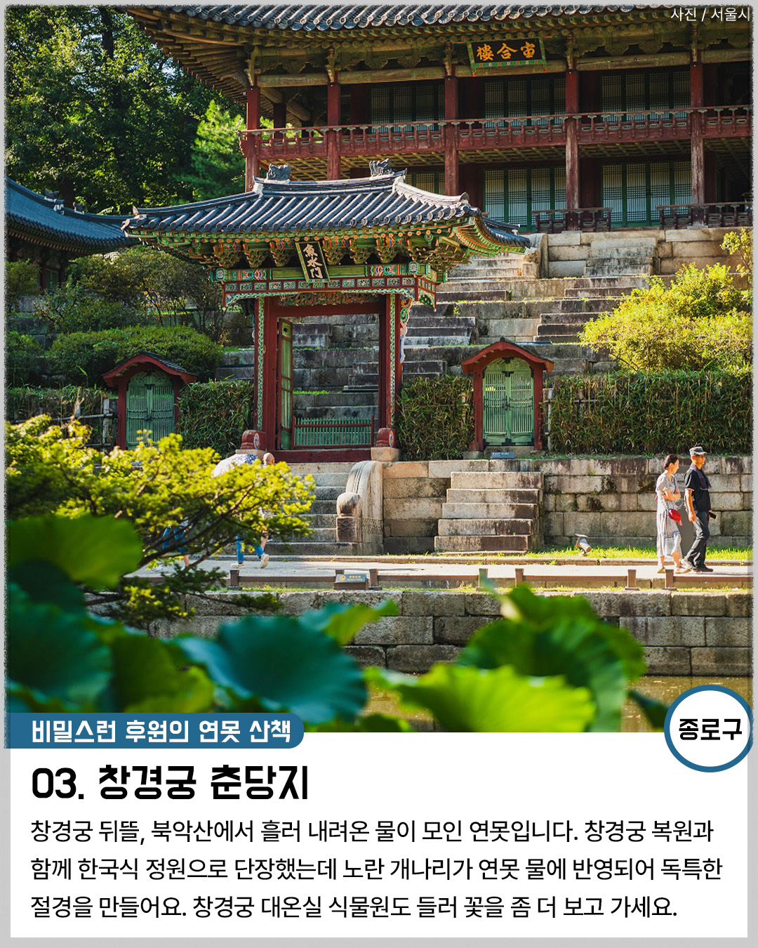 창경궁 뒤뜰, 북악산에서 흘러 내려온 물이 모인 연못입니다. 창경궁 복원과 함께 한국식 정원으로 단장했는데 노란 개나리가 연못 물에 반영되어 독특한 절경을 만들어요. 창경국 대온실 식물원도 들러 꽃을 좀 더 구경하고 가세요.