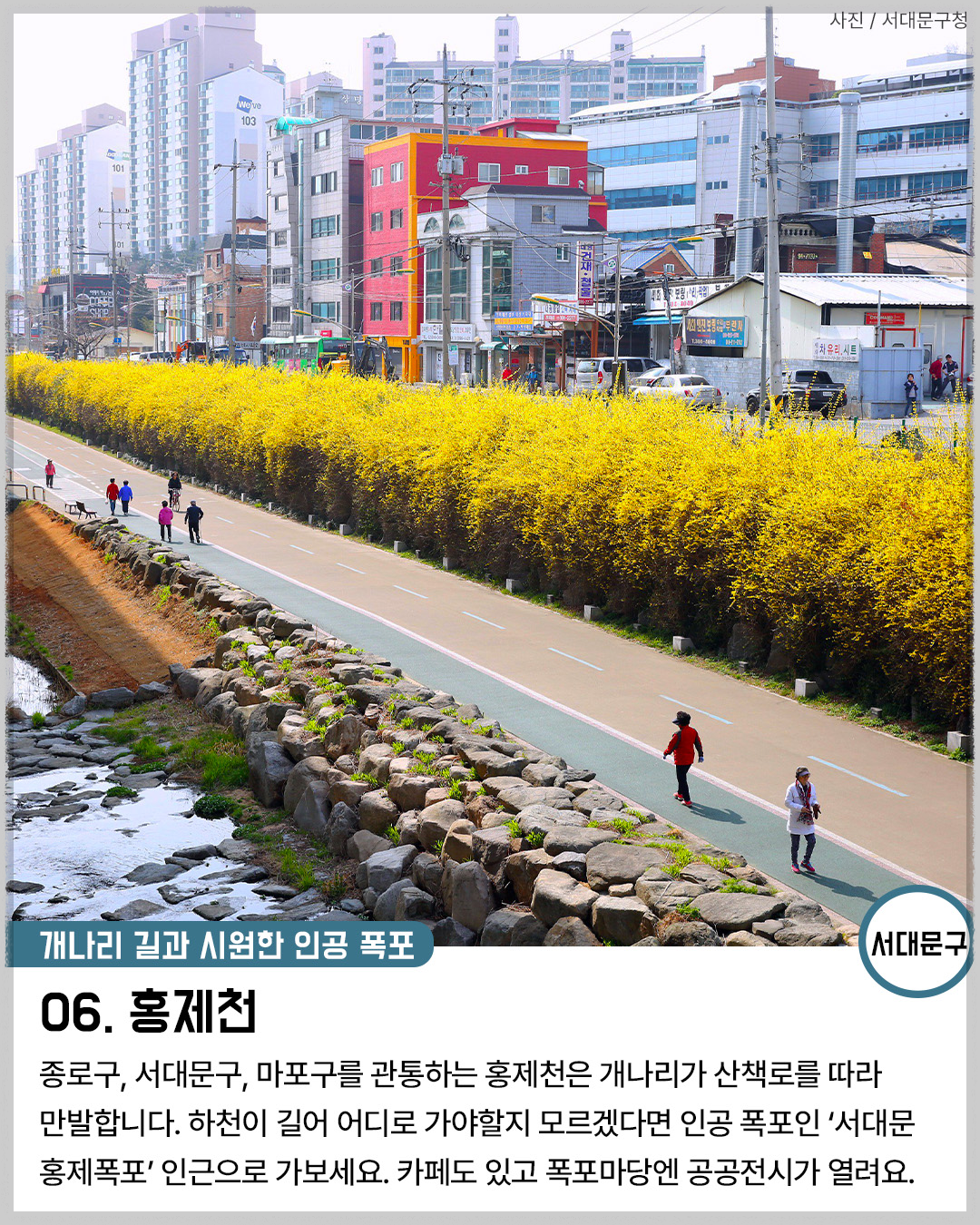 종로루, 서대문구, 마포구를 관통하는 홍제천은 개나리가 산책로를 따라 만발하는 곳이에요. 하천이 길어 어디로 가야 할지 모르겠다면 인공 목포인 '서대문 홍제폭포' 인근으로 가보세요. 카페도 있고, 폭포마당엔 공공전시가 열려요.