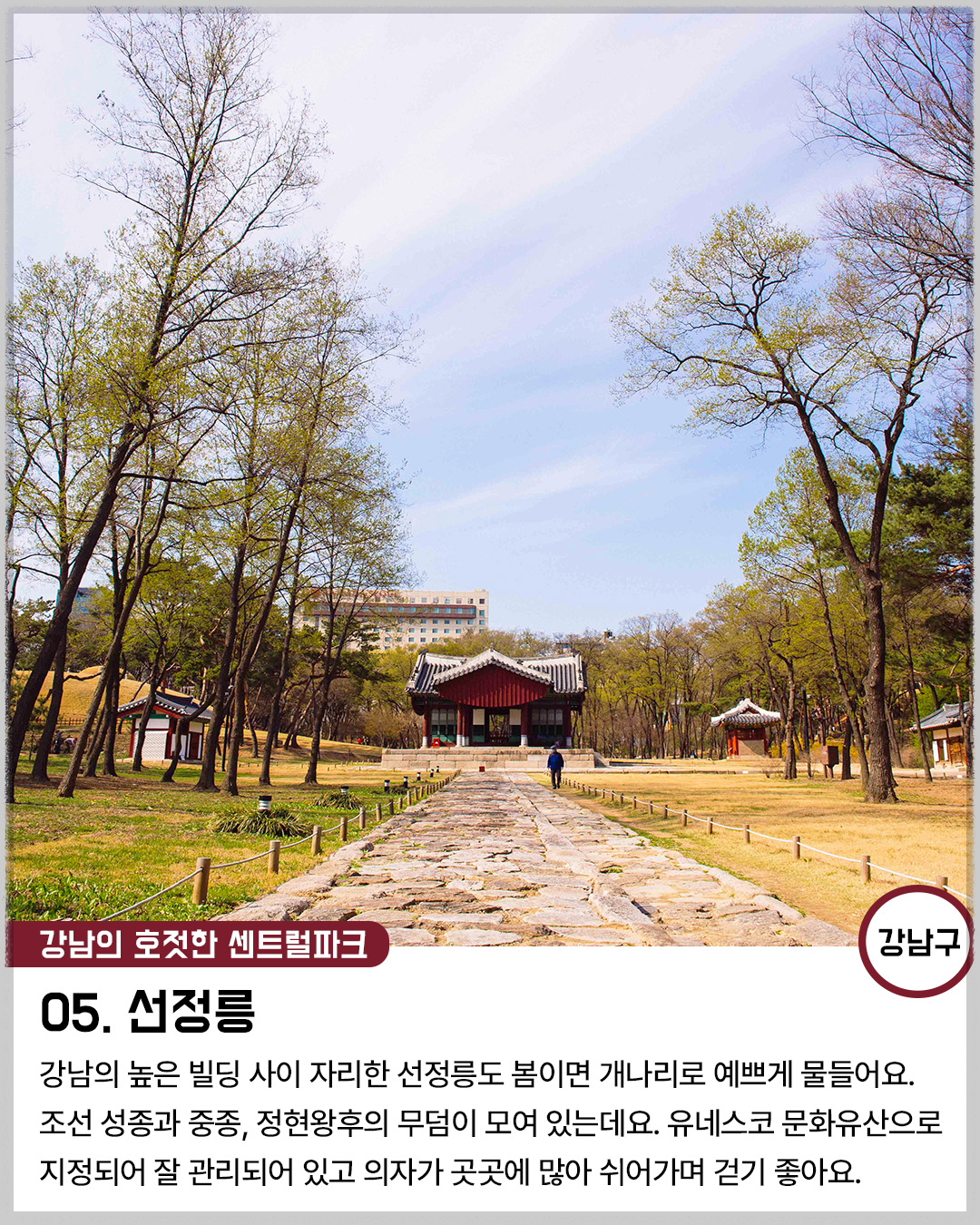 강남의 높은 빌딩 사이 자리한 선정릉도 봄이면 개나리로 예쁘게 물들어요. 조선 성정과 중종, 정현왕후의 무돔이 모여 있는데요. 유네스코 문화유산으로 지정되어 잘 관리되어 있고 의자가 곳곳에 있어 쉬어가며 걷기 딱 좋아요.